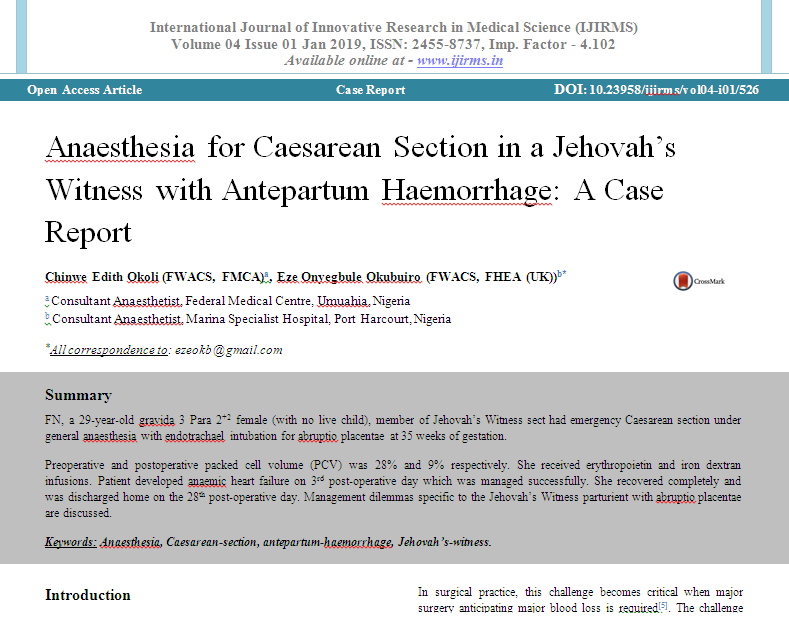 Anaesthesia for Caesarean Section in a Jehovah’s Witness with Antepartum Haemorrhage: A Case Report