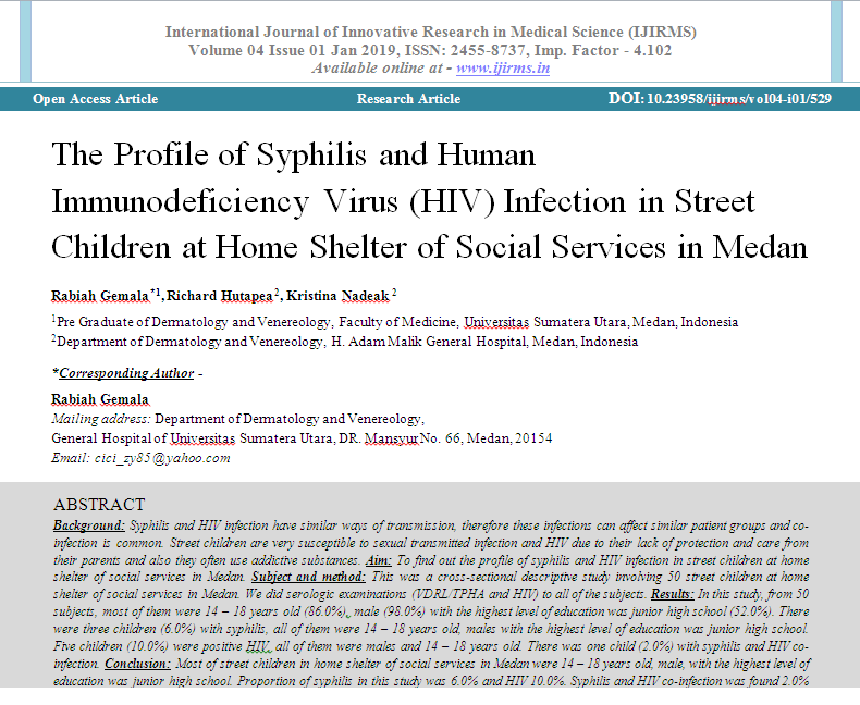 The The Profile of Syphilis and Human Immunodeficiency Virus (HIV) Infection in Street Children at Home Shelter of Social Services in Medan