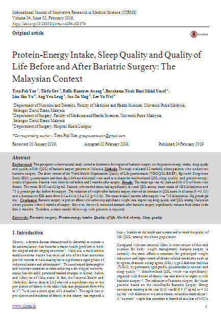 Protein-Energy Intake, Sleep Quality and Quality of Life Before and After Bariatric Surgery: The Malaysian Context