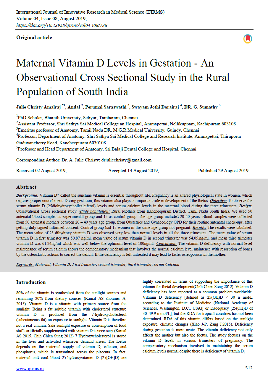 Maternal Vitamin D Levels in Gestation - An Observational Cross Sectional Study in the Rural Population of South India
