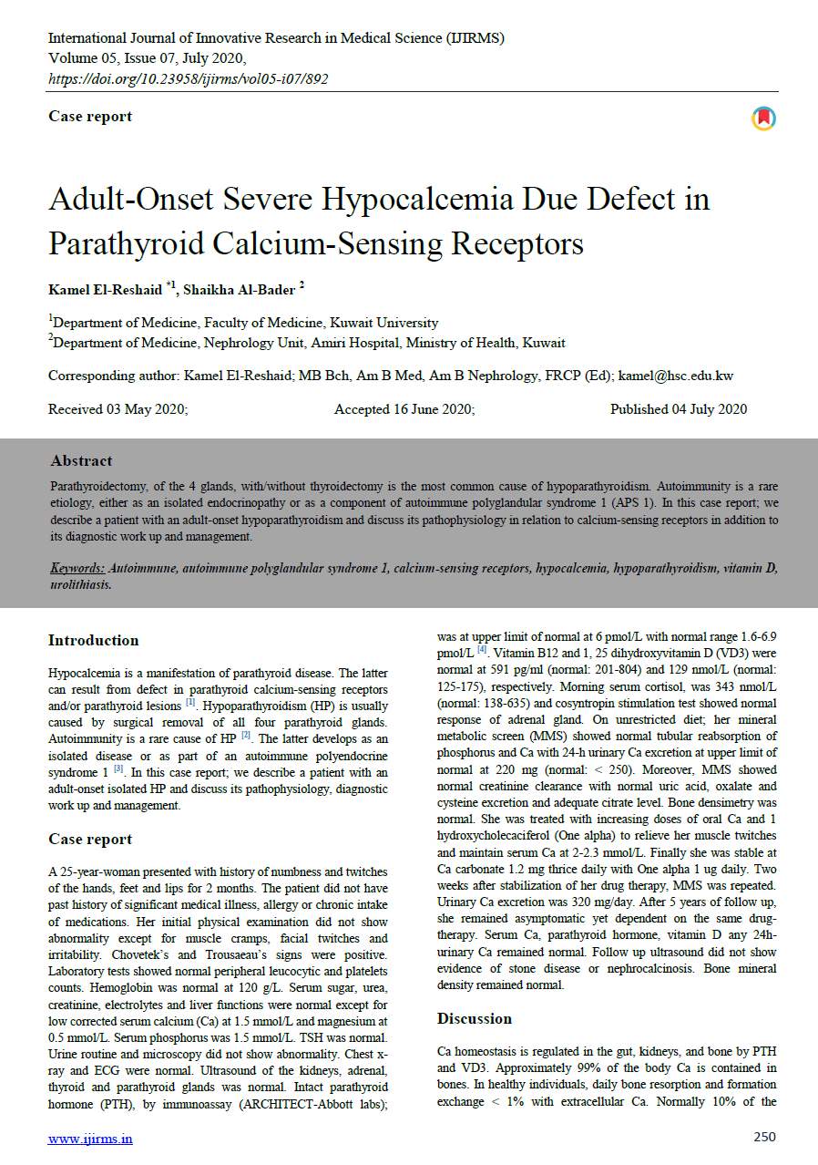 Adult-Onset Severe Hypocalcemia Due Defect in Parathyroid Calcium-Sensing Receptors