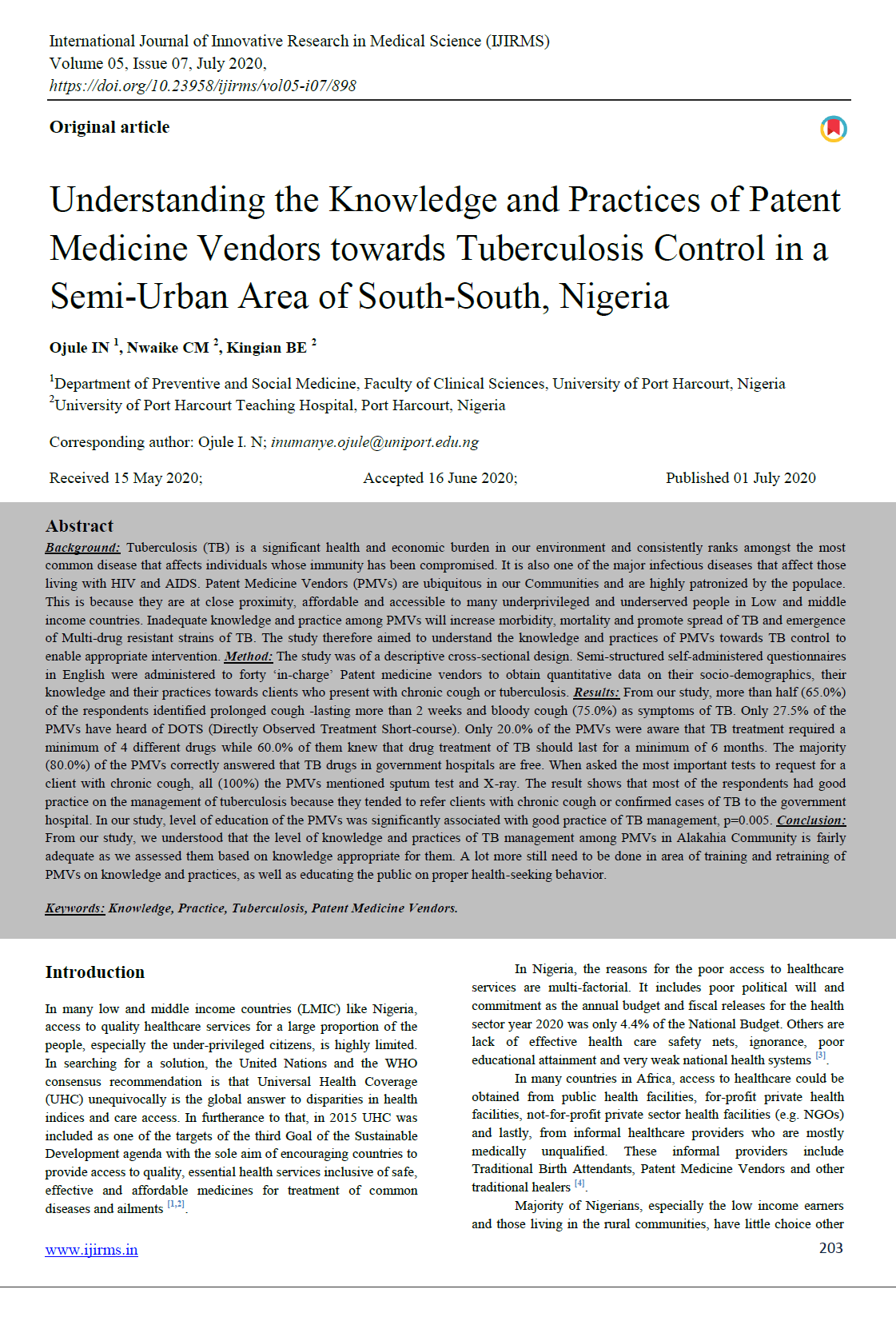 Understanding the Knowledge and Practices of Patent Medicine Vendors towards Tuberculosis Control in a Semi-Urban Area of South-South, Nigeria