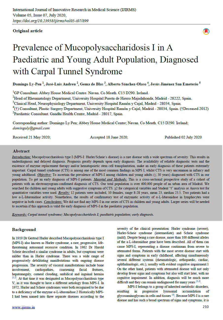 Prevalence of Mucopolysaccharidosis I in A Paediatric and Young Adult Population, Diagnosed with Carpal Tunnel Syndrome