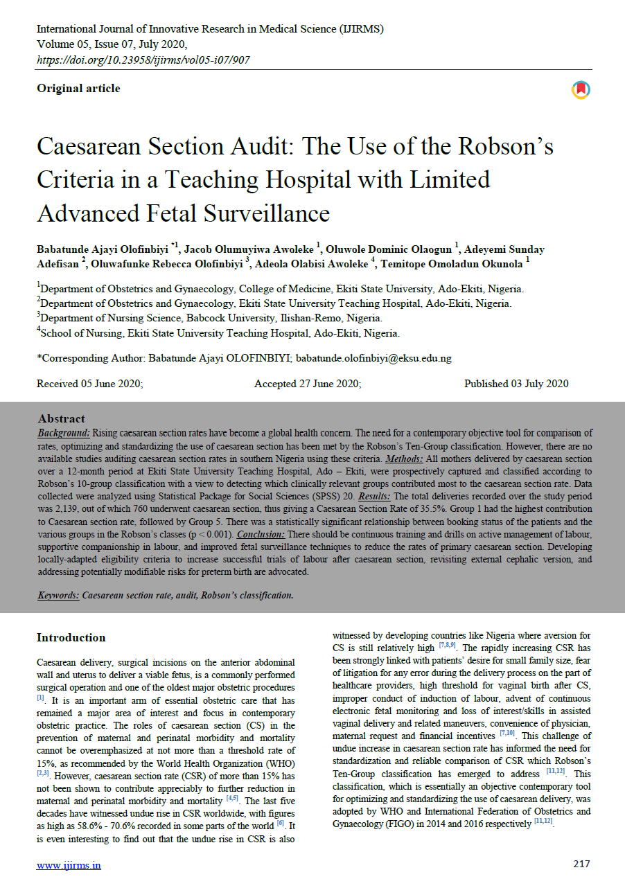 Caesarean Section Audit: The Use of the Robson’s Criteria in a Teaching Hospital with Limited Advanced Fetal Surveillance