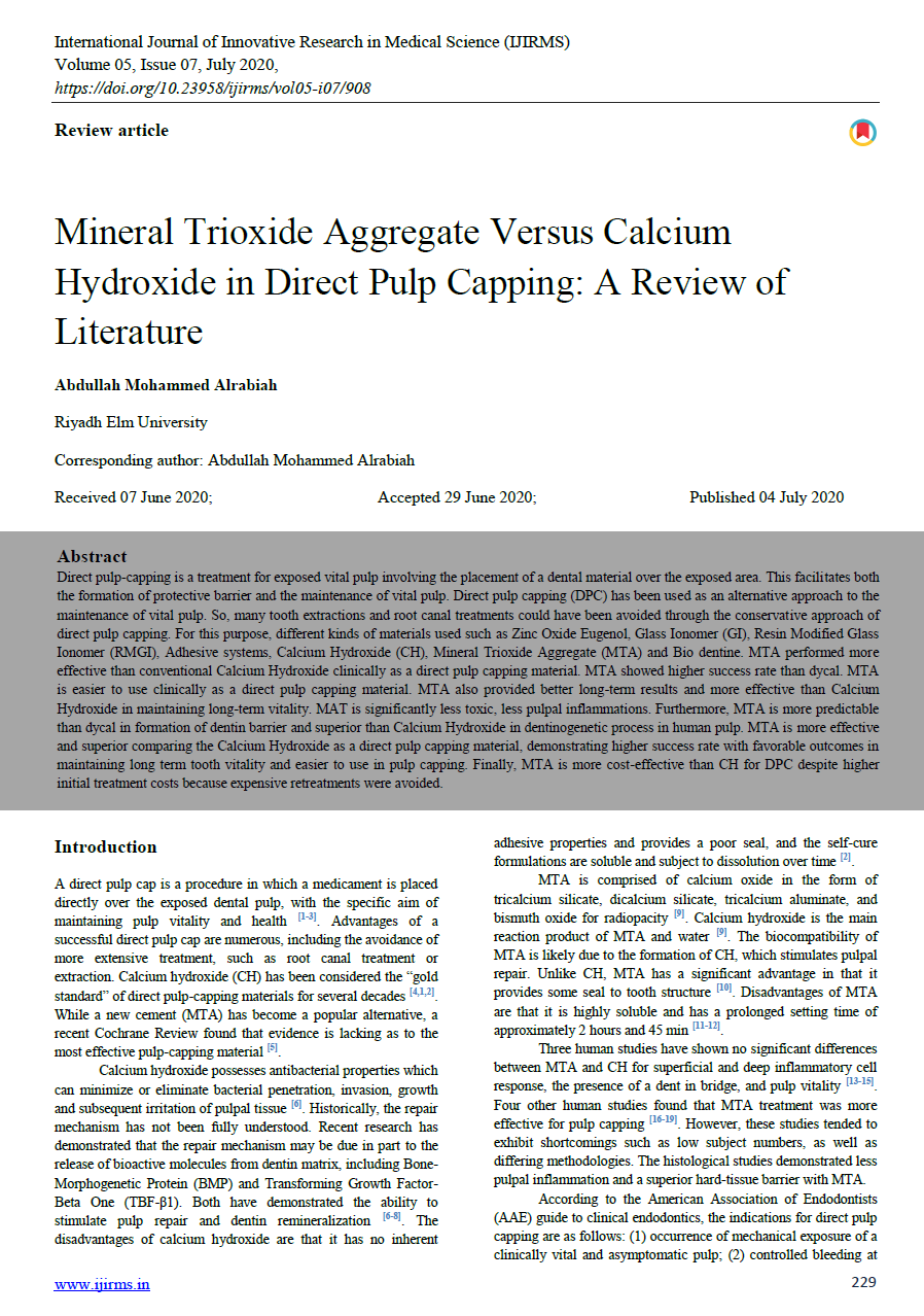 Mineral Trioxide Aggregate Versus Calcium Hydroxide in Direct Pulp Capping: A Review of Literature