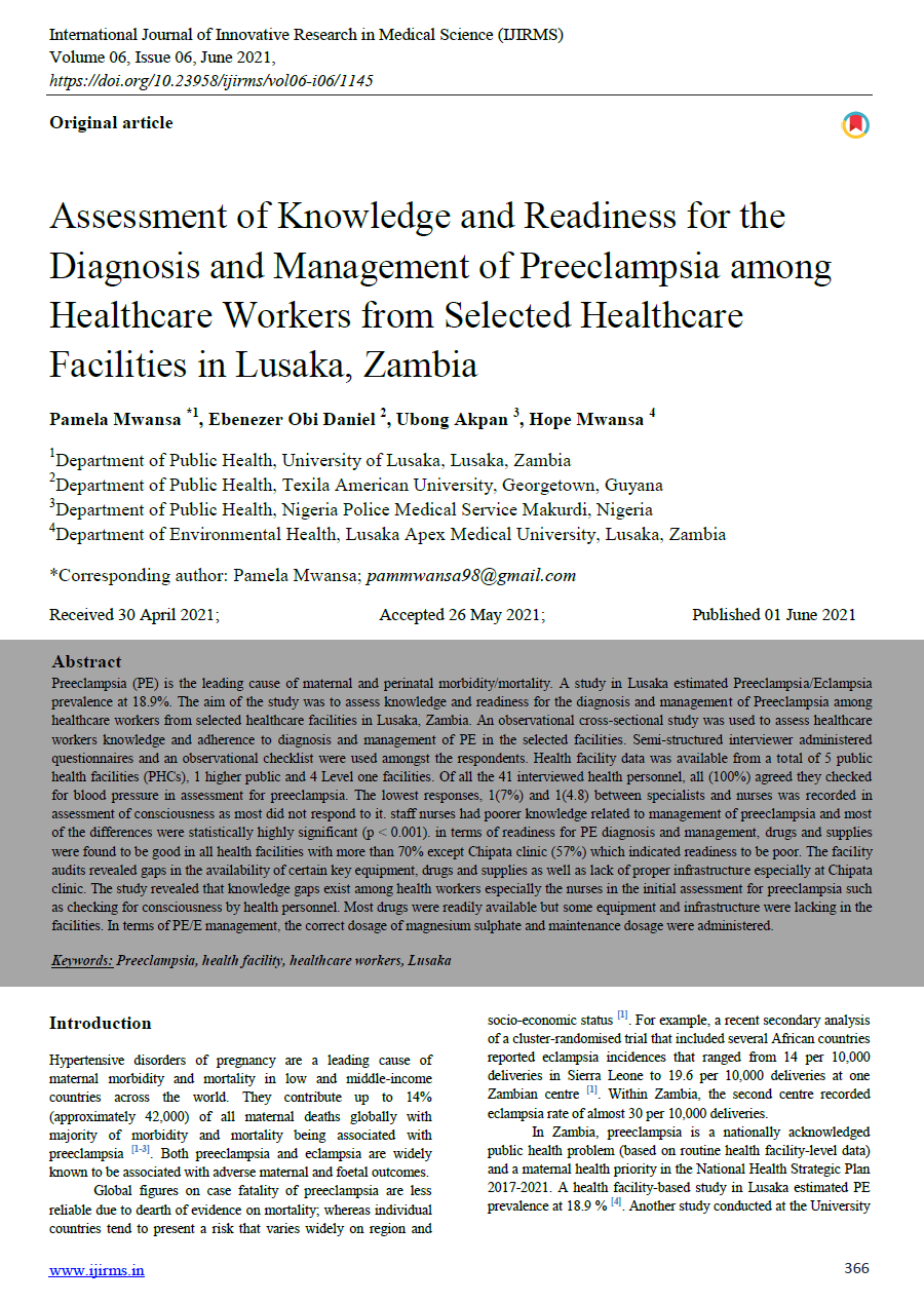 Assessment of Knowledge and Readiness for the Diagnosis and Management of Preeclampsia among Healthcare Workers from Selected Healthcare Facilities in Lusaka, Zambia
