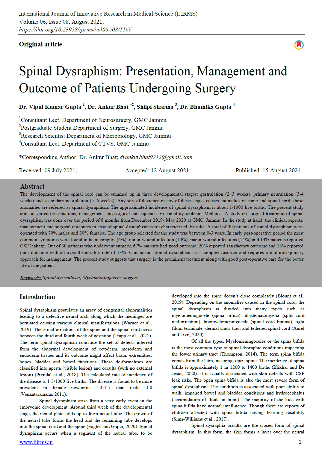Spinal Dysraphism: Presentation, Management and Outcome of Patients undergoing Surgery