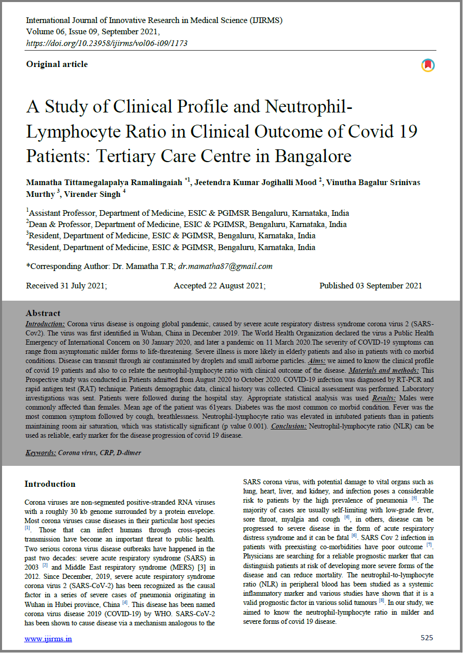 A Study of Clinical Profile and Neutrophil-Lymphocyte Ratio in Clinical Outcome of Covid 19 Patients: Tertiary Care Centre in Bangalore