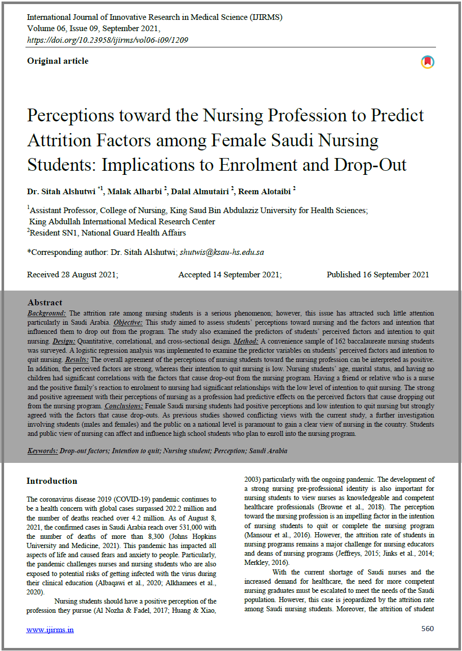Perceptions toward the Nursing Profession to Predict Attrition Factors among Female Saudi Nursing Students: Implications to Enrolment and Drop-Out