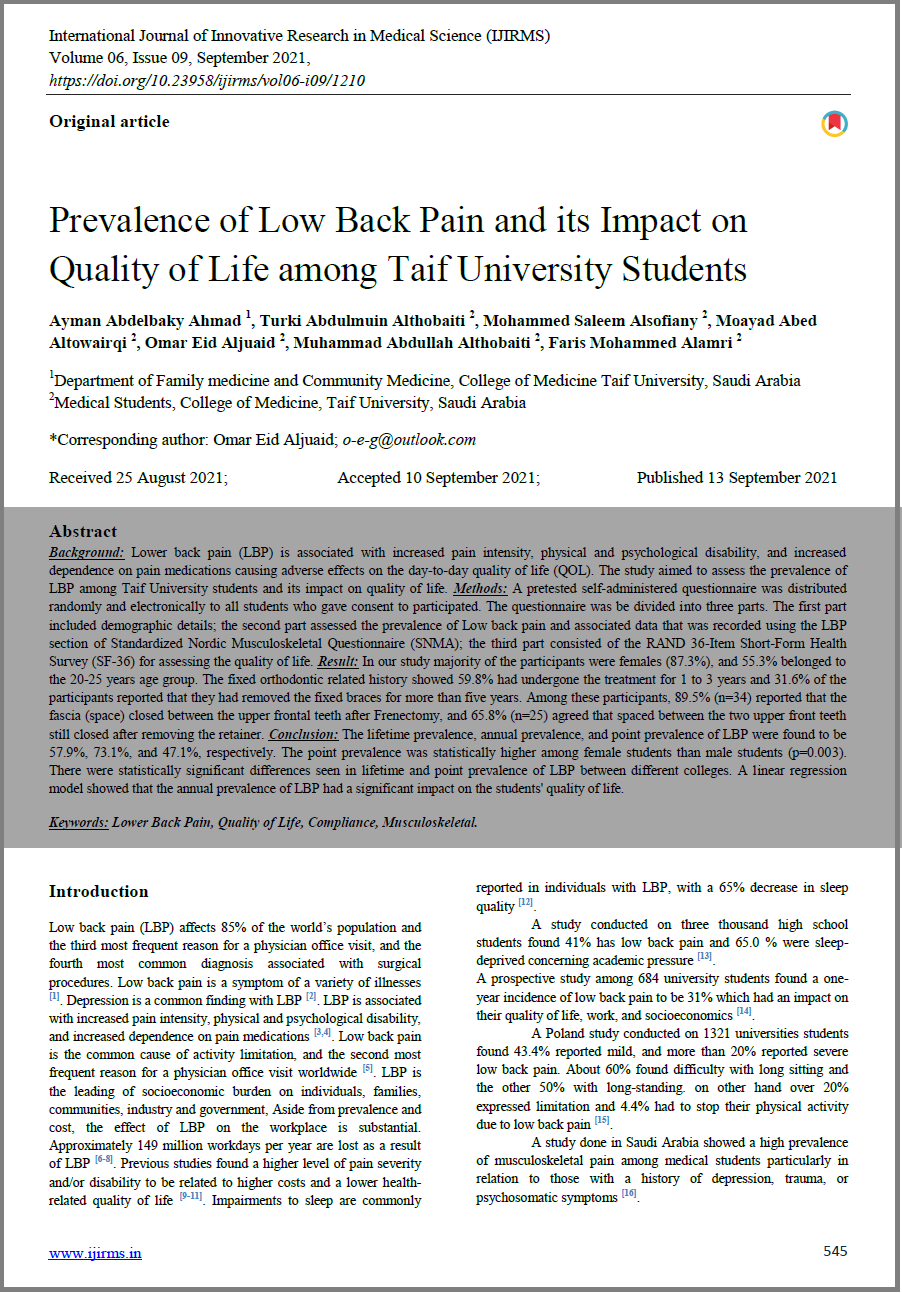 Prevalence of Low Back Pain and its Impact on Quality of Life among Taif University Students