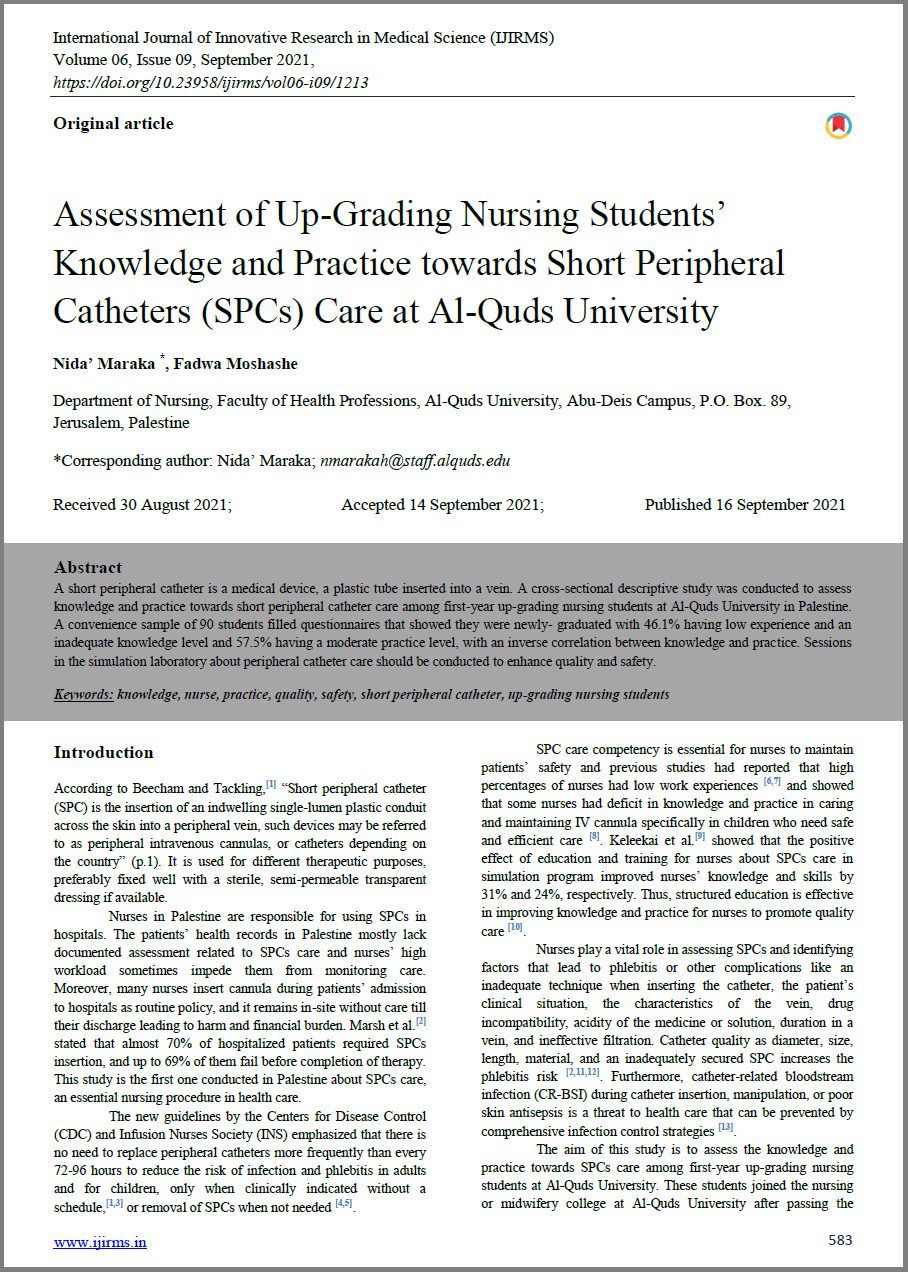 Assessment of Up-Grading Nursing Students’ Knowledge and Practice towards Short Peripheral Catheters (SPCs) Care at Al-Quds University