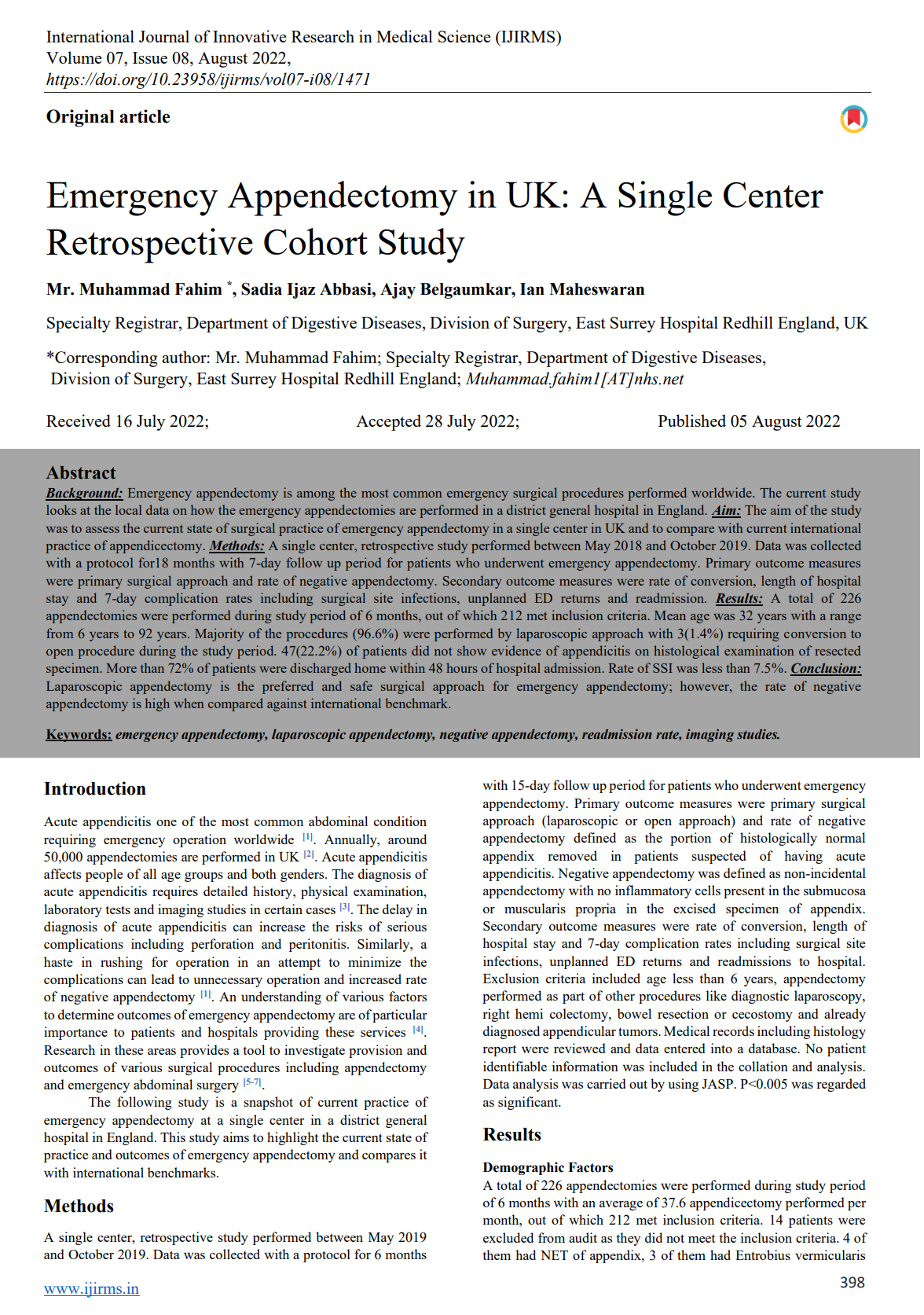 Emergency Appendectomy in UK: A Single Center Retrospective Cohort Study