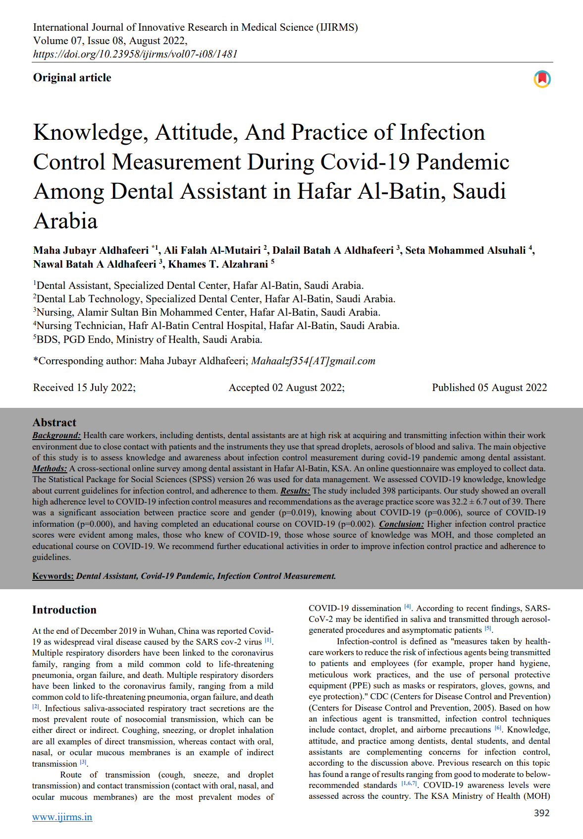 Knowledge, Attitude, And Practice of Infection Control Measurement During Covid-19 Pandemic Among Dental Assistant in Hafar Al-Batin, Saudi Arabia