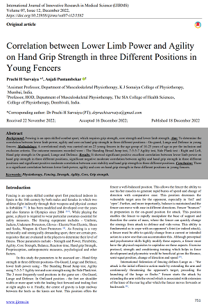 Correlation between Lower Limb Power and Agility on Hand Grip Strength in three Different Positions in Young Fencers